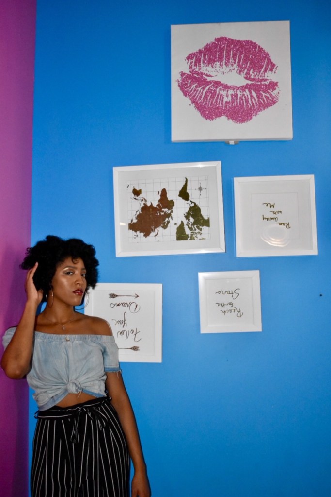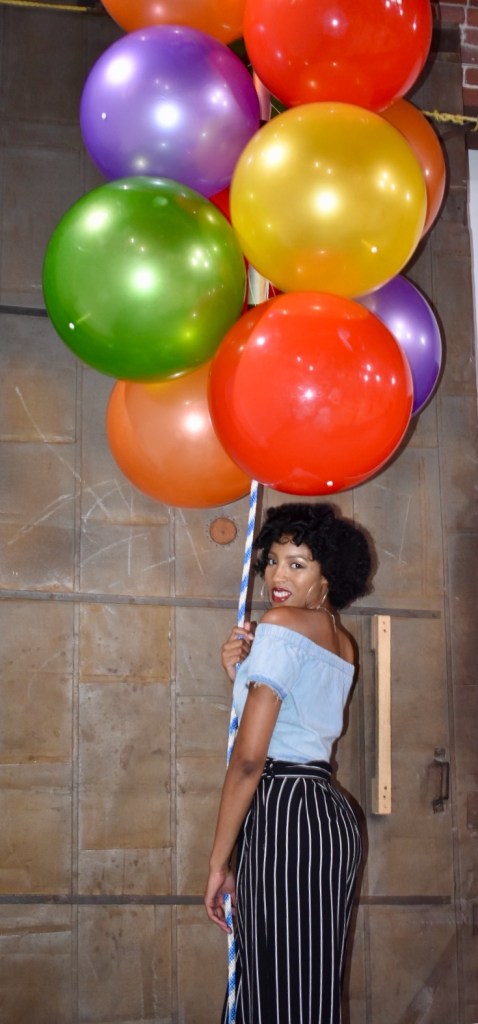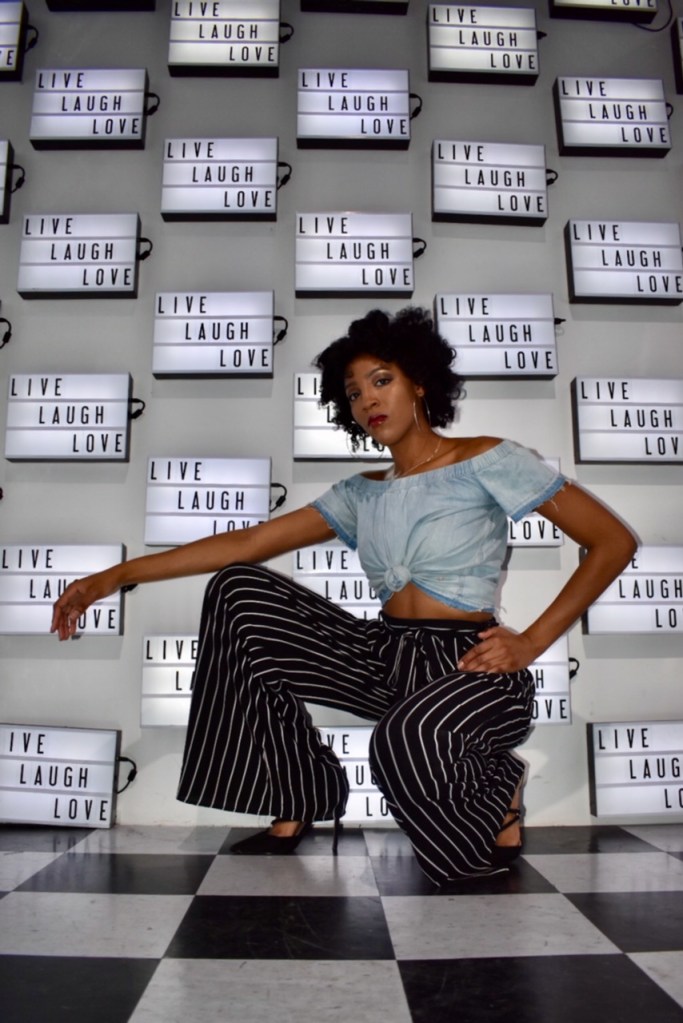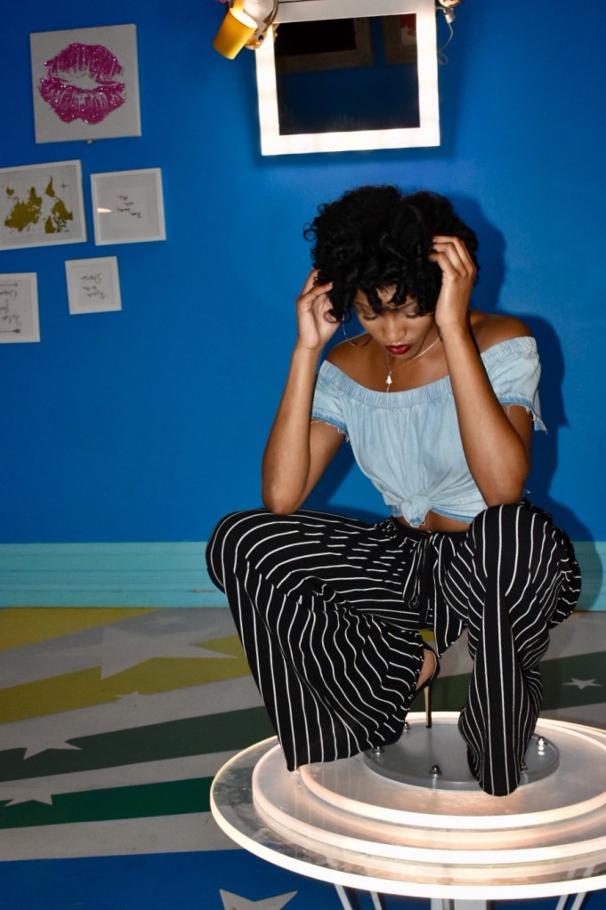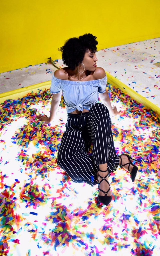 Yes, even Californian’s could use some sunshine, because sometimes, life can be downright shady. I was stoked to learn about HAPPY PLACE, the pop-up installation in the heart of the Arts District in Downtown LA. The carefully curated space features rooms designed to bring joy and provide guests with the perfect backdrop for borderline dramatic photos. From complimentary, M&Ms, cake pops, and popsicles to tantalize your palate, to a giant rainbow complete with a pot of gold, HAPPY PLACE is an absolute treat. I rocked striped pants and a denim top to soak up the happy. Style note: I tied my shirt to accentuate my waist. Works every time.